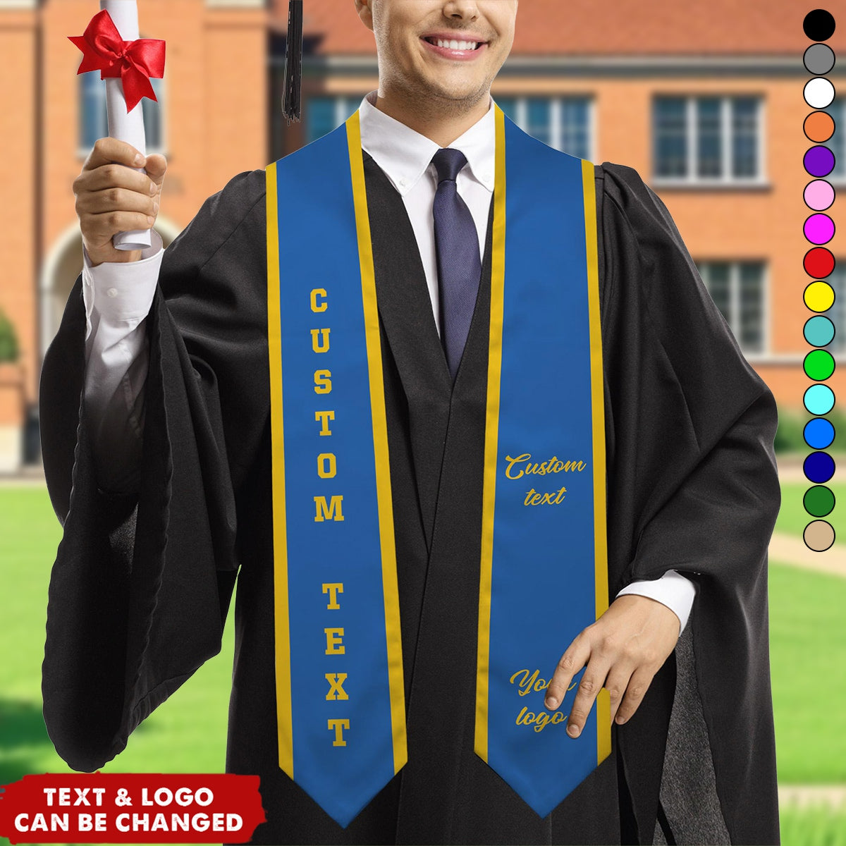 The Personalized Graduation Stole is a meaningful way to celebrate your academic achievement. Customized with your school logo and text, it's a unique tribute to your hard work and dedication. Perfect for graduation day, it's more than a stole - it's a symbol of pride and accomplishment. A thoughtful keepsake that honors your journey and the start of an exciting new chapter! This graduation stole combines practicality and convenience. It's machine washable, making it easy to clean and maintain. Simply wash in cold water and tumble dry on low to keep it looking fresh and vibrant.
