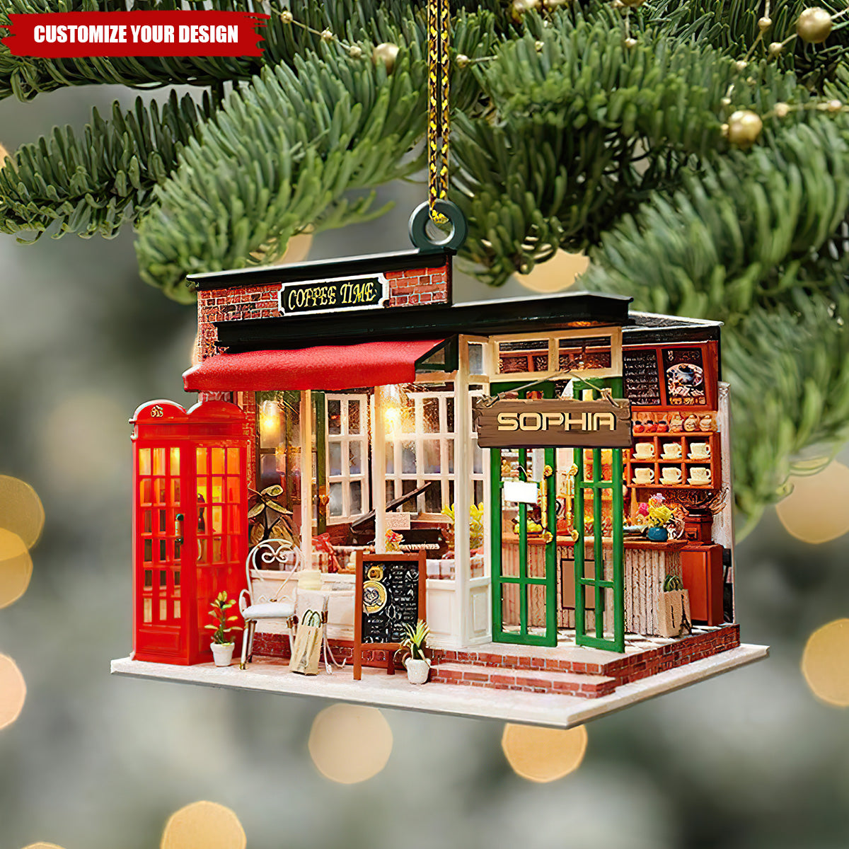 Personalized Coffee Shop Christmas Light Flat Ornament, Christmas Coffee Ornaments, Coffee Lover Xmas Gifts Caffein Ornament, Christmas Gift