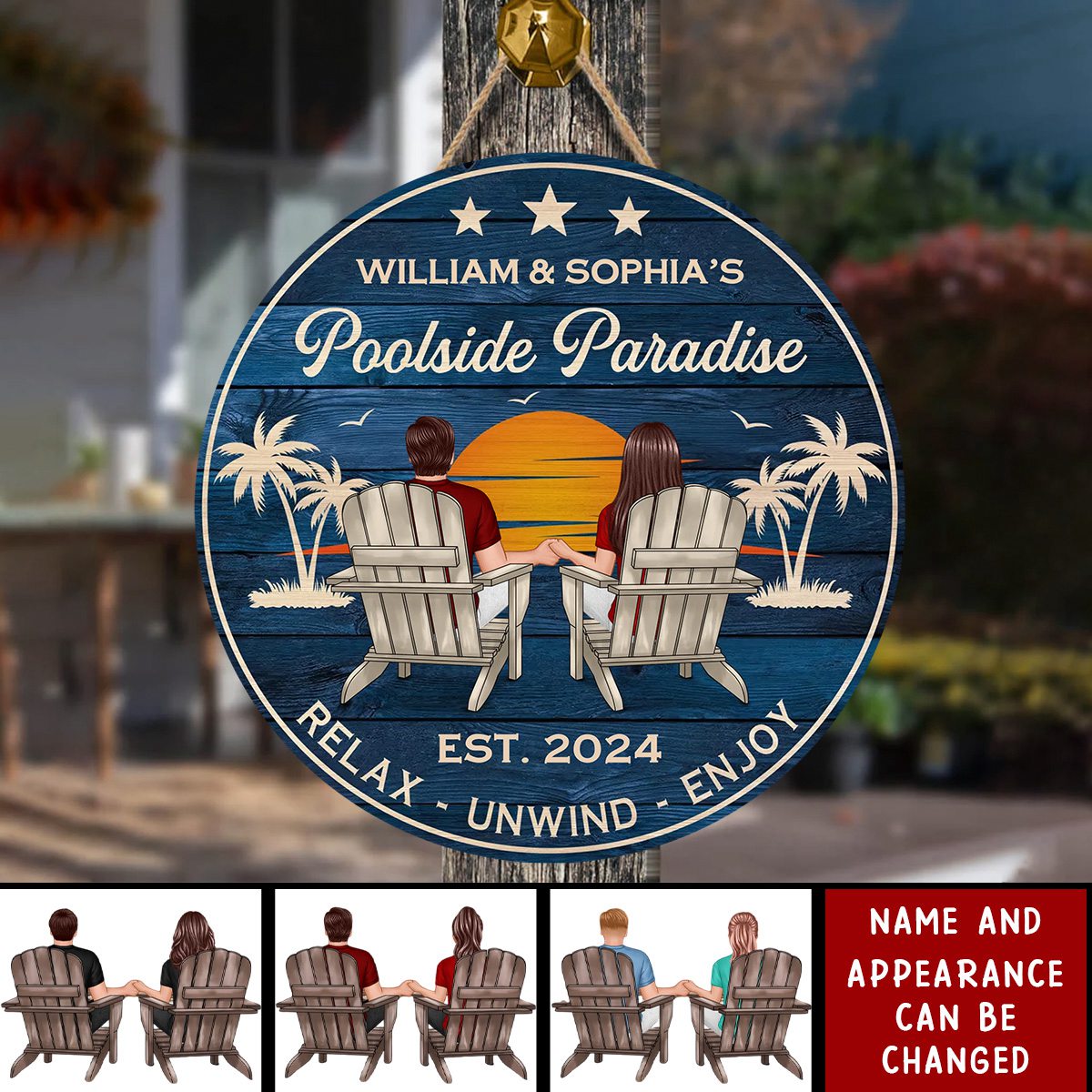 Swimming Pool Zone Decor Couple Sitting Personalized Wood Sign, Gift For Housewarming, Birthday, Anniversary