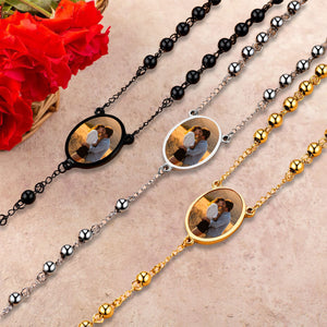 This personalized rosary necklace cradles your loved one's image within the cross, turning prayer into a sacred reunion. Handcrafted with smooth beads that glide through fingers during Hail Marys, it's wearable comfort for both spiritual practice and daily remembrance.